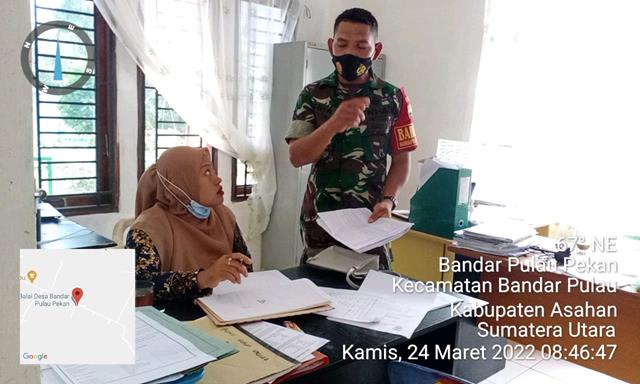 Asahan | Untuk meningkatkan kerja sama yang dengan apartatur desa diwilayah binaan, dalam hal ini seperti yang dilakukan oleh Personel Bintara Pembina Desa (Babinsa) Koramil 15/Bandar Pulau jajaran Kodim 0208/Asahan Sertu Fiha Tasykurun turun kewilayah binaan untuk melaksanakan kegiatan Komunikasi Sosial (Komsos) bersama dengan Kepala Desa Bapak Azaswanto dan Perangkat Desa Ibu Yusnita Ningsih (kaur pelayanan) dalam rangka untuk menjaga hubungan baik di wilayah binaannya, selain itu untuk meningkatkan kerjasama dalam mengatasi serta mencegah penyebaran Covid-19, kegiatan tersebut yang dilaksanakan bertempat di Kantor Desa Bandar Pulau Pekan Kecamatan Bandar Pulau Kabupaten Asahan, Kamis (24/03/2022).
