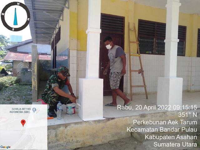 Asahan | Membantu kesulitan masyarakat sudah menjadi tanggung jawab seorang aparat teritorial, apalagi menjadi seorang Babinsa yang selalu berada diwilayah binaannya, sudah barang tentu jika diwilayahnya ada kegiatan sekecil apapun babinsa harus terjun secara langsung untuk membantu, seperti halnya yang dilakukan oleh Personel Bintara Pembina Desa (Babinsa) Koramil 15/Bandar Pulau jajaran Kodim 0208/Asahan Serda Erianto turun kewilayah desa binaan untuk melaksanakan kegiatan Komunikasi Sosial (Komsos) sekaligus membatu warga masyarakat di Desa Binaan dengan membantu warga memperbaiki dan mengecat sarana tempat menuntut Ilmu agama dan pengajian selama Bulan Suci Ramadhan bersama dengan Bapak H. Khairul (Pemilik Bangunan) dan Bapak Sahrul (Pekerja), kegiatan tersebut yang dilaksanakan bertempat di Dusun II Desa Perkebunan Aek Tarum Kecamatan Bandar Pulau Kabupaten Asahan, Rabu (20/04/2022).