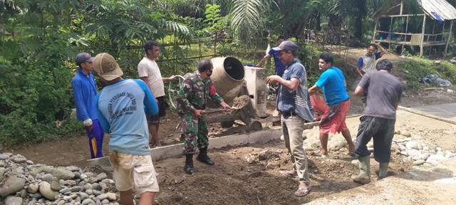 Dengan semangat gotong-royong masyarakat bersama Babinsa bahu membahu melaksanakan kegiatan pengecoran jalan yang saat ini kondisinya sangat mengkhawatirkan bagi pengguna jalan.