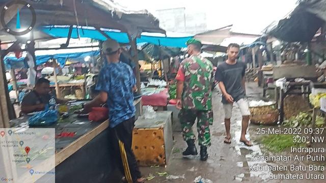Batu Bara | Dalam rangka agar para pedagang dan pembeli didiplin dalam menerapkan protokol kesehatan untuk mencegah penularan Virus Corona atau Covid-19, dalam hal ini Personil Bintara Pembina Desa (Babinsa) Koramil 02/Air Putih jajaran Kodim 0208/Asahan Pelda Sugito dan Serda A. Silaban turut serta melaksanakan giat Patroli Disiplin Mandiri Covid-19 di Pajak Delima Indrapura dengan memberikan arahan dan himbauan kepada pedagang dan pembeli agar selalu mentaati Protokoler Kesehatan dgn memakai masker, mencuci tangan sebelum dan sesudah beraktivitas untuk menghindari penularan/penyebaran virus Covid-19, kegiatan tersebut yang dilaksanakan bertempat di Pajak Delima Indrapura Kelurahan Indrapura Kecamatan Air Putih Kabupaten Batu Bara, Rabu (25/05/2022).