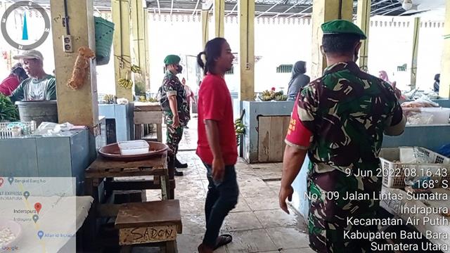 Batu Bara | Dalam rangka agar para pedagang dan pembeli disiplin dalam menerapkan protokol kesehatan untuk mencegah penularan Virus Corona atau Covid-19, dalam hal ini seperti yang dilakukan oleh Personil Bintara Pembina Desa (Babinsa) Koramil 02/Air Putih jajaran Kodim 0208/Asahan Sertu Ady Sutrisno dan Serda A. Rozak turut serta melaksanakan giat Patroli Disiplin Mandiri Covid-19 di Pajak Delima Indrapura dengan memberikan arahan dan himbauan kepada pedagang dan pembeli agar selalu mentaati Protokoler Kesehatan dgn memakai masker, mencuci tangan sebelum dan sesudah beraktivitas untuk menghindari penularan/penyebaran virus Covid-19, kegiatan tersebut yang dilaksanakan bertempat di Pajak Delima Indrapura Kelurahan Indrapura Kecamatan Air Putih Kabupaten Batu Bara, Kamis (09/06/2022).