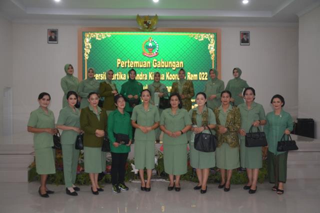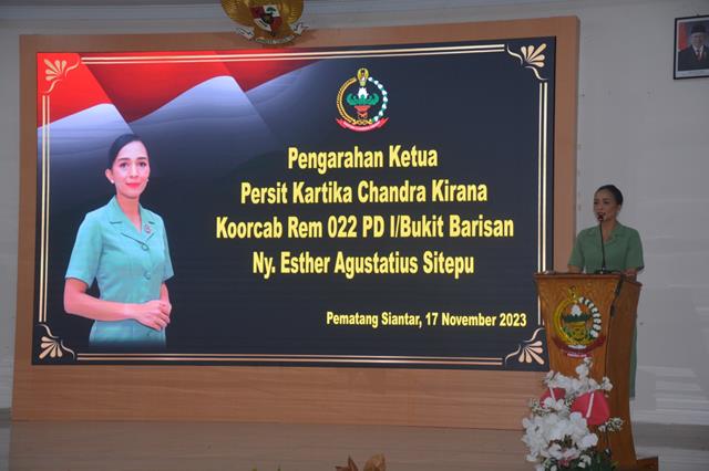Pematang Siantar | Pertemuan gabungan Anggota Persit KCK Koorcab Rem 022 PD I/BB yang dipimpin langsung oleh Komandan Korem (Danrem) 022/Pantai Timur Kolonel Inf Agustatius Sitepu , S.Sos. M.SI., M.Han, dan didampingi langsung oleh Ketua Persit Kartika Chandra Kirana Koorcab Rem 022 PD l/BB Ny Esther Agustatius Sitepu serta dihadiri oleh anggota Persit KCK sejajaran Koorcab Rem 022 PD l/BB, kegiatan tersebut dilaksanakan bertempat di Aula Pantai Timur Korem 022 Jalan Asahan Km. 3,5 Nagori Estate Kec. Siantar Kab. Simalungun, Jumat (17/11/2023).