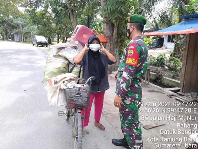 Tanjung Balai  |  Guna untuk memutus mata rantai penyebaran Virus Covid 19 di wilayah Binaan, Babinsa Koramil 17/Datuk Bandar jajaran Kodim 0208/Asahan, Kopda Wirton H Tamba melaksanakan pengawasan protokol covid-19 kepada masyarakat dengan memberikan pemahaman New Normal yaitu menggunakan masker setiap keluar rumah, cuci tangan pakai sabun, menjaga jarak dan membagikan masker. Kegiatan tersebut bertempat di Jalan Haji M Nur, Kelurahan Pahang, Kecamatan Datuk Bandar, Kota Tanjungbalai, Minggu (29/08/2021).