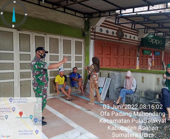 Asahan | Dalam rangka untuk melaksanakan kegiatan Komsos bersama warga membahas tentang tingkat keamanan di desa sehingga memberi rasa aman ditengah masyarakat, dalam hal ini seperti yang dilakukan oleh Personel Bintara Pembina Desa (Babinsa) Koramil 16/Pulau Rakyat jajaran Kodim 0208/Asahan Serma Syahminan dan 1 orang anggota Babinsa turun kewilayah binaan untuk melaksanakan kegiatan Komunikasi Sosial (Komsos) membahas tentang keamanan, ketertiban dan menghimbau warga untuk agar selalu mematuhi protokol kesehatan bersama dengan Saudara Yudi (Warga), Saudara Irwan (Warga), Saudari Yusmidar (Warga) dan Saudari Santi (Warga), kegiatan tersebut yang dilaksanakan bertempat di Dusun 1 Ofa Padang Mahondang Kecamatan Pulau Rakyat Kabupaten Asahan, Jumat (03/06/2022).