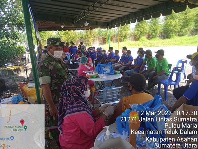 Asahan  |  Agar terjalinya hubungan yang harmonis antara TNI dengan masyarakat, dalam hal ini seprti yang dilakukan oleh Personel Bintara Pembina Desa (Babinsa) Koramil 11/Simpang Empat jajaran Kodim 0208/Asahan Sertu Saidi dan Koptu Hambali Daulay turun kewilayah banana untuk melaksanakan kegiatan dalam rangka mendampingi Dinas kesehatan dalam rangka pelaksanaan Suntik Vaksinasi Dosis 1, 2 dan 3 ( Booster) Covid-19, kegiatan tersebut yang dilaksanakan bertempat di PT Satu Pulau Maria Kecamatan Teluk Dalam Kabupaten Asahan, Sabtu (12/03/2022).