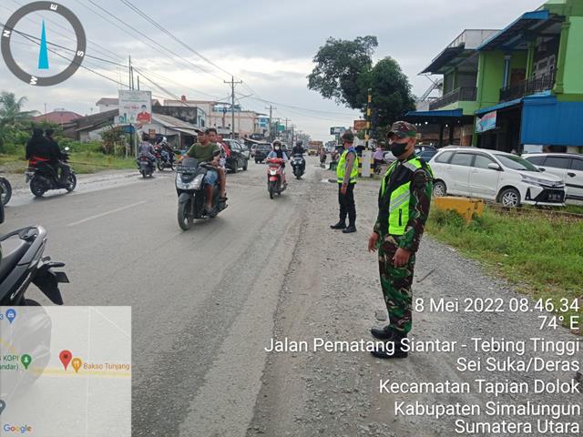 Batu Bara  |  Dalam rangka agar terciptanya sinergi kerjasama antara TNI/POLRI dan Instansi terkait dalam pengamanan lalu lintas serta penerapan protokol kesehatan bagi masyarakat yang melaksanakan libur lebaran, dalam hal ini seperti yang dilakukan oleh Personel Bintara Pembina Desa (Babinsa) Koramil 02/Air Putih jajaran Kodim 0208/Asahan Serda Ngatiran turut serta melaksanakan kegiatan (Pos Pantau II) Lebaran Idhul Fitri 1443 H Ops Ketupat Toba Thn 2022, bersama dengan Personel Gabungan diantaranya adalah Personel Polri : 2 Org, Personel Dishub : 1 Org dan TNI : 1 Org, kegiatan tersebut yang dilaksanakan bertempat di Jalan Lintas Sumatera Desa Kebun Kopi (Rel Kereta Api) Kecamatan Sei Suka Kabupaten Batu Bara, Minggu (08/05/2022).