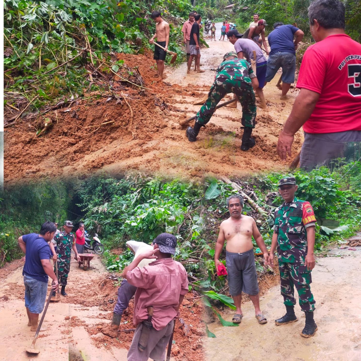 Deliserdang – Akibat intensitas hujan tinggi sejak sore hingga malam hari, mengakibatkan jalan di Dusun 11 Proyek Desa Gunung Rintih Kecamatan STM Hilir Kabupaten Deli Serdang tertimbun longsor tanah. Mengetahuinya hal tersebut, Personel Koramil 20/Talun Kenas jajaran Kodim 0204/Deliserdang langsung turun kelokasi untuk berupaya mengatasi bencana longsor di desa binaannya itu. Selasa (26/12/2023).