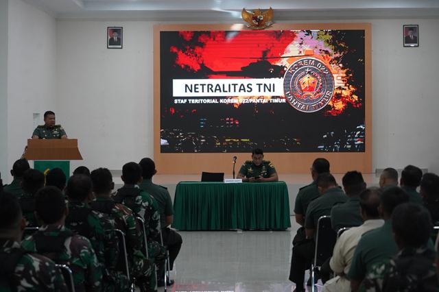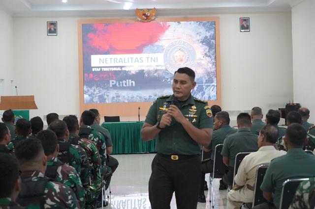 Untuk itu, saya ingatkan kembali kepada seluruh prajurit agar tetap berpegang teguh Netralitas TNI. Apabila ada yang melanggar komitmen tersebut, sanksinya jelas, akan diproses secara hukum. Dengan demikian pertahankan dan tingkatkan hal-hal yang sudah baik selama ini, karena Netralitas TNI merupakan Hal yang Mutlak dan tidak bisa di tawar – tawar.”Ujar Danrem.