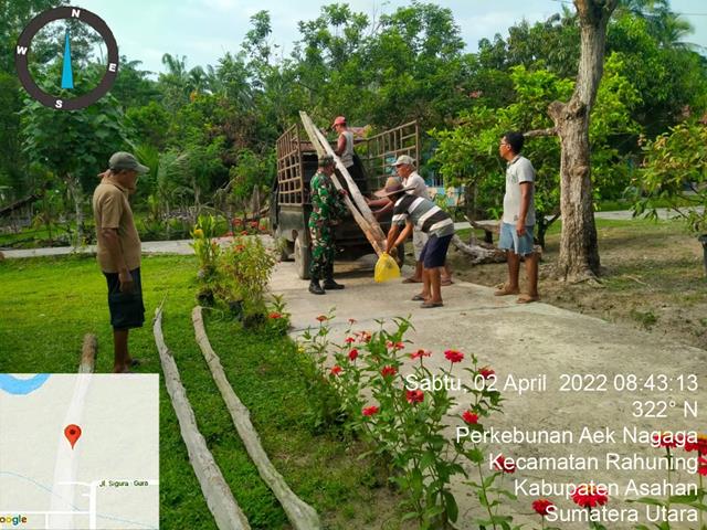 Asahan | untuk penerangan jalan agar kelancaran menuju mesjid melaksanakan ibadah tarawih, dan sholat subuh berjamaah. Koramil 15/Bandar Pulau, Babinsa Serda Zulkifli Hutapea turut serta melaksanakan kegiatan gotong royong mendirikan tiang lampu jalan di Dusun 1 Desa Perkebunan Aek Nagaga, Kecamatan Rahuning, Kabupaten Asahan, Sabtu (02/04/2022).