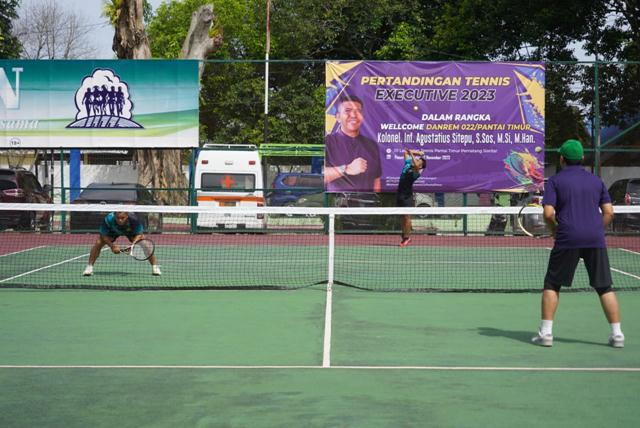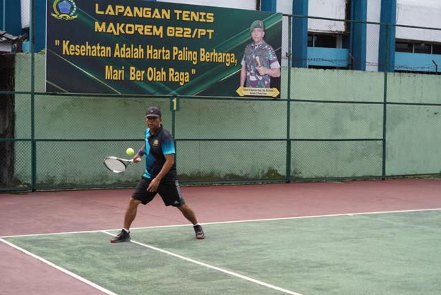Pertandingan Turnamen Tenis Lapangan di tandai dengan pemukulan bola pertama oleh Danrem 022/PT