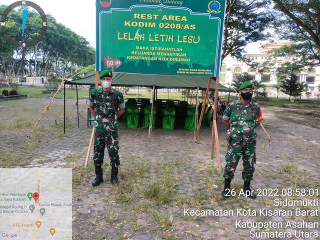 Selain menggelar Pos pemantau arus lalu lintas juga disediakan rest area bagi para pemudik yang ingin istirahat sejenak guna melepas lelah dan ngantuk juga disediakan beberapa makanan ringan bagi para pemudik yang kebetulan mampir disana. Babinsa Serda Hendro Sucipto yang berada di Pos Pam bergabung dengan petugas lainnya, hal serupa juga dilakukan oleh para Babinsa lainnya di Pos Pam Rest Area, menurutnya pengamanan tahun ini berbeda dari pengamanan seperti tahun kemarin. Karena tahun ini pelaksanaan pengamanan ditengah-tengah wabah pendemi virus corona atau Covid-19, yang terjadi diseluruh Indonesia, termasuk Kabupaten Asahan.