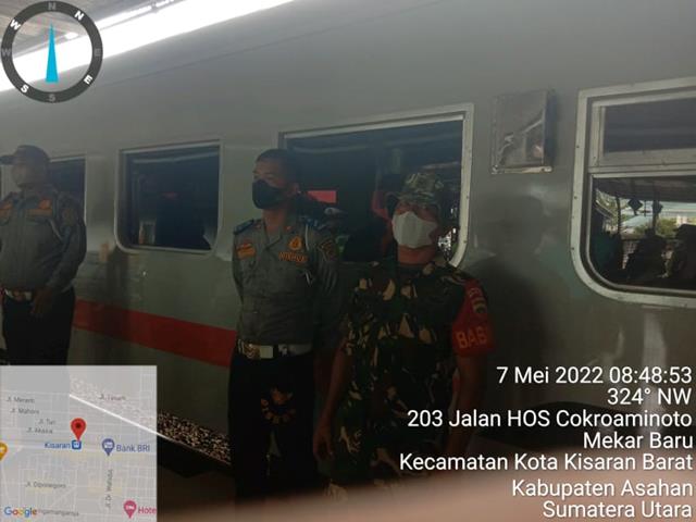 Asahan | Dalam rangka agar terciptanya sinergi kerjasama antara TNI-POLRI dan Instansi terkait dalam pengamanan lalu lintas serta penerapan protokol kesehatan bagi masyarakat yang melaksanakan liburan, dalam hal ini seperti yang dilakukan oleh Personel Bintara Pembiona Desa (Babinsa) Koramil 06/Kisaran jajaran Kodim 0208/Asahan Serda Kamaruddin turut serta melaksanakan kegiatan Pam Terpadu Arus Balik Mudik Ops Ketupat Tahun 2022, kegiatan tersebut yang dilaskanakan bertempat di Stasiun Kereta Api Kisaran Jalan Cokroaminoto Kelurahan Mekar Baru Kecamatan Kisaran Barat Kabupaten Asahan, Sabtu (07/05/2022).