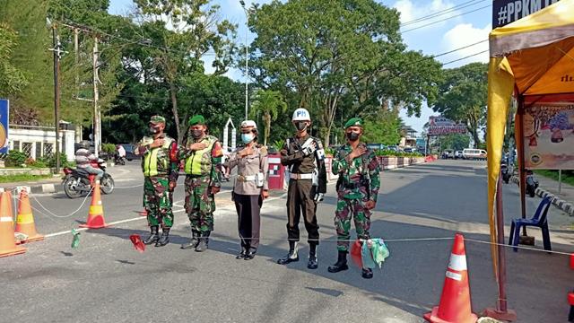 Pematang Siantar | Dalam rangka untuk mencegah penyebaran Virus Covid-19 diwilayah Kota Pematang Siantar dan Kabupaten Simalungun, dalam kesempatan ini pengendalian PoskoPenyekatan PPKM Level lV dilakukan oleh Personel Bintara Pembina Desa (Babinsa) Koramil 10/Balimbingan jajaran Kodim 0207/Simalungun Serka Amsal Tobing bersama Gabungan Personil anggota Polres turut serta melaksanakan kegiatan Ops PPKM Skala Micro dengan Level lV dengan menghimbau Masyarakat untuk tidak memasuki kota Pematang Siantar, kegiatan Pos Penyekatan PPKM Level lV tersebut yang dilaksanakan bertempat di depan Bank BRI Jalan Merdeka Kota Pematang Siantar, Selasa (07/09/2021).