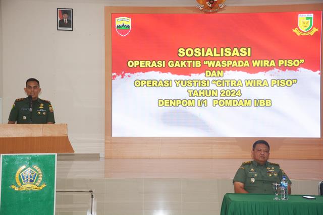 Pematang Siantar | Dalam rangka meningkatkan Disiplin dan mencegah terjadinya Pelanggaran, dalam kesempatan ini Prajurit dan PNS di jajaran Korem 022/Pantai Timur turut serta mengikuti Sosialisasi Operasi Gaktib Waspada Wira Piso dan Operasi Yustisi Citra Wira Poso yang digelar oleh Denpom l/1 Pematang Siantar, kegiatan tersebut yang dilaksanakan bertempat di Aula Pantai Timur Makorem 022/PT Jalan Asahan Km 3,5 Kecamatan Siantar Kabupaten Simalungun. Senin (22/01/2024).