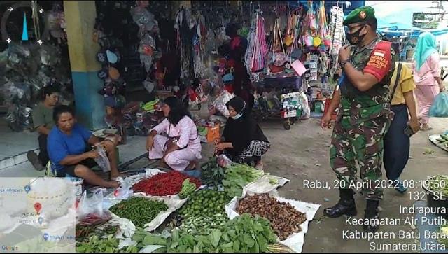 Batu Bara | Dalam rangka agar para pedagang dan pembeli merasa nyaman dan senang dengan adanya himbauan dari Babinsa, seperti yang dilakukan oleh Personel Bintara Pembina Desa (Babinsa) Koramil 02/Air Putih jajaran Kodim 0208/Asahan Pelda Sugito dan Kopda S. G Tampubolon turun kewilayah binaan untukmelaksanakan Pam Disiplin Mandiri Covid-19 di Pasar Delima Indrapura dengan menghimbau kepada para pedagang dan pembeli agar selalu mencuci tangan dgn sabun, menggunakan masker dan menjaga jarak serta menghindari kerumunan guna mencegah penularan Covid-19, kegiatan tersebut yang dilaksanakan bertempat di Pasar Delima, Kelurahan Indrapura, Kecamatan Air Putih, Kabupaten Batu Bara, Senin (13/12/2021).