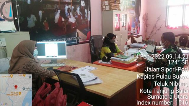 Tanjung Balai  |  Kegiatan komunikasi sosial bertujuan untuk mempererat tali silaturahmi, dan kerjasama yang erat dalam rangka mewujudkan kemanunggalan, serta mendata para siswa-siswi yang telah melaksanakan vaksin, dalam hal ini seperti yang dilakukan oleh Personel Bintara Pembina Desa (Babinsa) Koramil 08/Pulau Buaya jajaran Kodim 0208/Asahan Sertu HM Pasaribu turun kewilayah binaan untuk melaksanakan kegiatan Komunikasi Sosial (Komsos) bersama dengan Kepala Sekolah dan staf (para Guru-guru) dalam rangka Sosialisasi Vaksin kepada anak usis 6-11 tahun dan tetap mematuhi Prokes dalam proses belaja mengajar bersama dengan Ibu Mailina Spd (Kepala sekolah) dan Ibu Idah (Guru staf), kegiatan tersebut yang dilaksanakan bertempat di SD Negeri 136537 Kelurahan Kapias Pulau Buaya Kecamatan Teluk Nibung Kota Tanjung Balai, Jumat (04/02/2022).