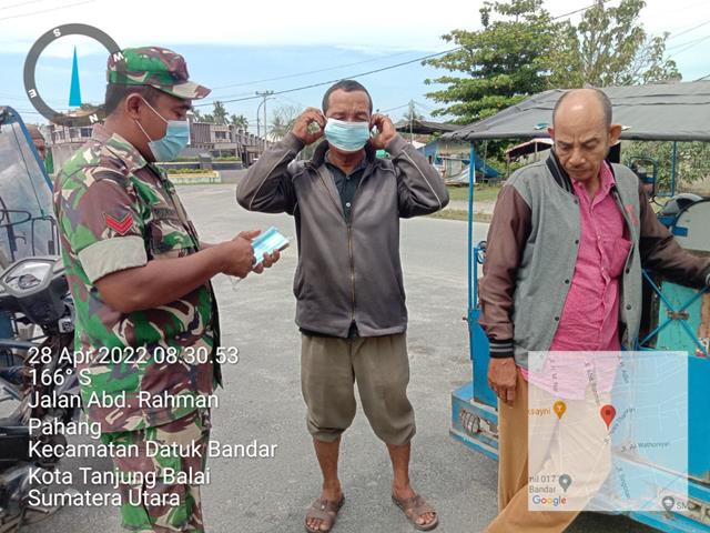 Tanjung Balai | Guna untuk memutus mata rantai penyebaran Virus Covid 19 di wilayah Binaan, dalam rangka pembatasan Kegiatan Masyarakat (PPKM) berskala mikro dikeluarkan pemerintah pusat sejak 9 Februari 2021 lalu. Pembatasan diarahkan pada skop yang lebih spesifik, yakni di tingkat Kelurahan, Desa, hingga RT/RW. Menyikapi hal tersebut Personel Bintar Pembina Desa (Babinsa) Koramil 17/Datuk Bandar jajaran Kodim 0208/Asahan Koptu Ruswandy turun kewilayah binaan untuk melaksanakan Pengawasan Protokol Kesehatan Covid-19 kepada masyarakat dengan memberikan pemahaman New Normal yaitu menggunakan masker setiap keluar rumah, cuci tangan pakai sabun, menjaga jarak dan membagikan masker, kegiatan tersebut yang dialskanakan bertempat di Jalan Abd. Rahman Kelurahan Pahang Kecamatan Datuk Bandar Kota Tanjung Balai, Kamis (28/04/2022).