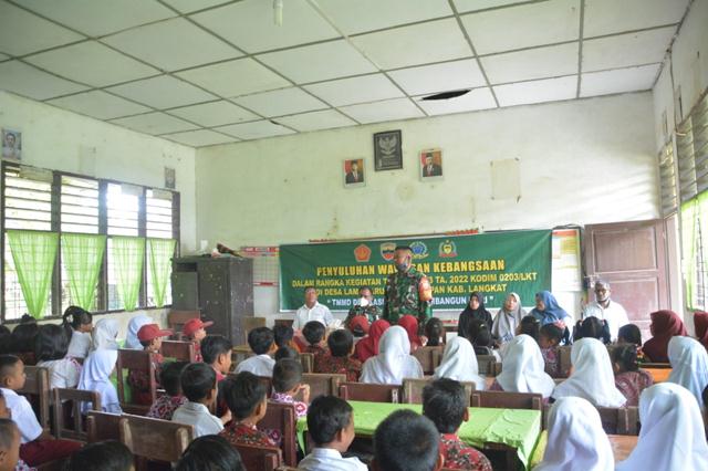 Langkat – Kodim 0203/Lkt menggelar penyuluhan tentang Wasbang yang merupakan sasaran non fisik program TMMD ke – 113 Kodim 0203/Lkt di SD Negeri 058244 Wonorejo Jln. Bakti ABRI Desa Lama Baru Kec. Sei Lepan Kab. Langkat.Kamis (19/5/2022).