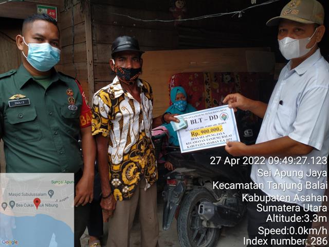 Asahan | KPM-BLT (Keluarga Penerima Manfaat-Bantuan Langsung Tunai) tersebut merupakan bantuan dari pemerintah kepada warga yang terdampak pandemi covid-19, dalam hal ini Personel Bintara Pembina Desa (Babinsa) Koramil 08/Pulau Buaya jajaran Kodim 0208/Asahan Praka Fadli Siagian turun kewilayah binaan untuk melaksanakan kegiatan pendampingan Pembagian KPM-BLT (Keluarga Penerima Manfaat-Bantuan Langsung Tunai) secara Door to Door untuk Bulan Januari, Februari, Maret dengan senilai Rp 900.000 untuk 116 penerima yang dilakukan bersama dengan Bapak Ikmal Rambe (Kades), Farhan (Kadus), Ibu Jumiah (Kasi Pem) dan Masyarakat penerima bantuan (BLT), kegiatan tersebut yang dilaksanaka bertempat di Dusun l Desa Sei Apung Jaya Kecamatan Tanjung Balai Kabupaten Asahan, Rabu (27/04/2022).