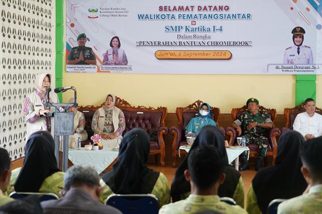 Sambutan Walikota Pematangsiantar dr. Susanti Dewayani Sp.a, ” Kami berharap Bantuan ini diterima dan manfaatnya bisa dirasakan anak2 sekolah SD SMP Swasta Kartika I-4 dan juga dirawat supaya masa pakai nya bertahan lama. Semoga program pemerintahan generasi emas 2045 bibit2 nya muncul dari SD SMP Swasta Kartika I-4 ini kedepan nya”. adapun tujuan Pemanfaatan Chromebook untuk Pembelajaran pada Sekolah Penerima Bantuan ini agar para Siswa’i mendapatkan bimbingan dalam pemanfaatan Chromebook secara maksimal beserta aplikasi-aplikasi didalamnya yang dapat menunjang dan meningkatkan proses pembelajaran, menunjang serta meningkatkan proses pembelajaran yang baik.