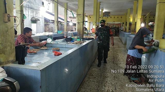 Batu Bara | Para pedagang dan pembeli merasa senang dengan adanya himbauan untuk mematuhi protokoler kesehatan dari Babinsa, guna untuk memutus mata rantai penyebaran Virus Covid 19 di wilayah Binaan, dalam hal ini seperti yang dilakukan oleh Personel Bintara Pembina Desa (Babinsa) Koramil 02/Air Putih jajaran Kodim 0208/Asahan Sertu Risman dan Serda Hendra. S turut serta pengawasan protokol Covid-19 kepada masyarakat dengan memberikan pemahaman New Normal, Pam Disiplin Mandiri Covid-19 di Pasar Delima Indrapura dengan menghimbau kepada para pedagang dan pembeli agar selalu mencuci tangan dgn sabun, menggunakan masker dan menjaga jarak serta menghindari kerumunan guna mencegah penularan Covid-19. Giat tersebut dilaksanakan di Pasar Delima, Kelurahan Indrapura, Kecamatan Air Putih Kabupaten Batu Bara, Kamis (10/02/2022).