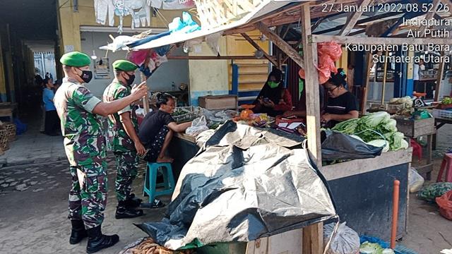 Batu Bara  |  Sebagai tombak masyarakat, Babinsa berperan sebagai aparat dalam memberikan pedoman yang benar. Seperti yang dilakukan oleh Bintara Pembina Desa koramil 02/Air Putih jajaran Kodim 0208/Asahan Peltu Budi S dan Serda Dedi Afandi yang turut serta melaksanakan kegiatan pengamanan disiplin mandiri covid 19 di Pasar Delima guna menghimbau kepada pedagang dan pembeli agar tetap menggunakan masker dan menjaga jarak dan tidak lupa mencuci tangan guna memutuskan penyebaran Covid-19, kegiatan tersebut yang dilaksanakan bertempat di Pasar Delima Kelurahan Indrapura Kecamatan Air Putih Kabupaten Batu Bara, Kamis (27/01/2022).