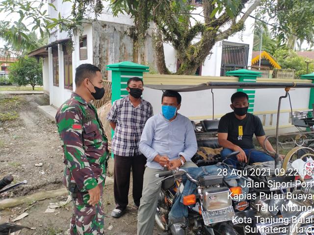 Tanjung Balai | Dalam rangka untuk menghindari penyebaran Covid-19, dalam hal ini Personel Bintara Pembina Desa (Babinsa) anggota Koramil 08/Pulau Buaya jajaran Kodim 0208/Asahan Praka Fadli Siagian turun kewilayah binaan untuk melaksanakan kegiatan Komunikasi Sosial dengan masyarakat untuk menjalin silahturahmi sekaligus menghimbau agar selalu menjaga kesehatan dengan mentaati Prokes sekaligus memberikan Penegakan Disiplin Protokol Kesehatan (GAKPLIN) diwilayah binaan bersama dengan Bapak Darwis, Bapak Ucok dan Bapak Hendra, kegiatan tersebut yang dilaksanakan bertempat di Jalan Sipori Pori Kelurahan Kapias Pulau Buaya Kecamatan Teluk Nibung Kota Tanjung Balai, Sabtu (28/08/2021).
