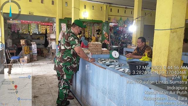 Batu Bara | Aktivitas masyarakat di pasar tradisional menjadi perhatian dari tim gabungan satgas penanganan Covid-19 di daerah, dengan melaksanakan patroli disiplin mandiri covid 19 dipasar delima indrapura menghimbau kepada pedagang dan pembeli agar tetap menggunakan masker dan menjaga jarak serta tidak lupa mencuci tangan guna memutuskan penyebaran Covid-19. Seperti halnya yang dilakukan oleh Personel Bintara Pembina Desa (Babinsa) Koramil 02/Air Putih jajaran Kodim 0208/Asahan Serda Hendra. S dan Koptu Irpan Sinaga melaksanakan Pam Disiplin Mandiri Covid-19 di Pasar Delima Indrapura dengan menghimbau kepada para pedagang dan pembeli agar selalu mencuci tangan dengan sabun, menggunakan masker dan menjaga jarak serta menghindari kerumunan guna mencegah penularan Covid-19. Kegiatan tersebut bertempat di Pasar Delima, Kelurahan Indrapura, Kecamatan Air Putih, Kabupaten Batubara, Kamis (17/03/2022).