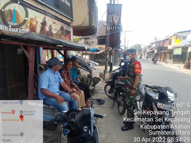 Asahan | Dalam rangka agar terjalinnya hubungan yang Harmonis antara Babinsa Koramil 10/SK dengan warga masyarakat Desa Sei Kepayang Tengah Sebagai bentuk sarana untuk mendekatkan diri dengan masyarakat, dalam hal ini seperti yang dilakukan oleh Personel Bintara Pembina Desa (Babinsa) Koramil 10/Sei Kepayang jajaran Kodim 0208/Asahan Sertu Tugimin turun kewilyayah binaan untuk melaksanakan kegiatan menghimbau kepada masyarakat agar mematuhi Protokol Kesehatan, memakai Masker, menjaga jarak dan menghindari keramaian supaya terhindar dari Covid-19, kegiatan tersebut yang dilaksanakan bertempat di Jalan Lintas Tanjung Balai Tanjung Ledong Desa Sei Kepayang Tengah Kecamatan Sei Kepayang Kabupaten Asahan, Sabtu (30/04/2022).