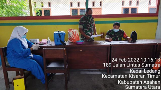 Asahan  |  Agar Masyarakat selalu menjaga kesehatan guna memutus penyebaran mata rantai Virus Corona (Covid-19). Dalam hal ini seperti yang dilakukan oleh Komandan Koramil (Danramil) 06/Kisaran Kapten Inf Algi Fahri bersama dengan Personel Bintara Pembina Desa (Babinsa) Koramil 06/Kisaran jajaran Kodim 0208/Asahan Sertu Windu Budi Asmoro turun kewilayah binaan untuk turut serta mendampingi pada pelaksanaan Vaksinasi yang ada diwilayah binaan tersebut, dalam pelaksanaan Vaksinasi tersebut yang dilaksanakan bertempat di Pos Polisi Kota Jalan Iman Bonjol Lingkungan 5 Kelurahan Kisaran Timur Kecamatan Kisaran Timur Kabupaten Asahan, Kamis (24/02/2022).