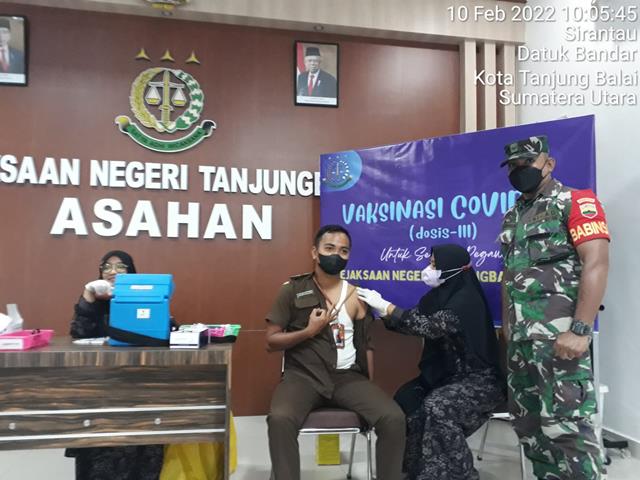 Tanjung Balai | Untuk memberi rasa aman nyaman kepada warga binaa yang menerima vaksinasi, dalam hal ini seperti yang dilakukan oleh Personel Bintara Pembina Desa (Babinsa) Koramil 17/Datuk Bandar jajaran Kodim 0208/Asahan Serda H.J Tampubolon turun kewilayah binaan untuk melaksanakan Pendampingan Vaksinasi terhadap masyarakat yang bertujuan untuk mencegah penularan Covib-19 serta dalam rangka guna memperkuat daya tahan tubuh dari wabah virus Covid 19 dan sekaligus untuk mengingatkan warga agar tetap memakai masker apabila keluar rumah dan harus mamatuhi Prokes dengan tetap menjaga 3M agar mematuhi Prokes dengan cara menjaga jarak, mencuci tangan dan memakai masker jika keluar rumah guna memutus mata rantai penyebaran virus Covit-19, kegiatan tersebut yang dilaksanakan bertempat di Kejaksaan Negri Tanjung Balai Jalan Jenderal Sudirman Kelurahan Sirantau Kecamatan Datuk Bandar Kota Tanjung Balai, Kamis (10/02/2022).