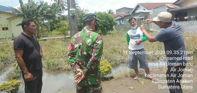 Asahan | Dalam rangka meningkatkan sinergitas di wilayah binaanya, Personel Bintara Pembina Desa (Babinsa) Koramil 07/Air Joman jajaran Kodim 0208/Asahan Serma Hendra Yatno terus aktif melaksanakan kegiatan Komunikasi Sosial (Komsos) bersama seluruh elemen masyarakat, seperti pada Komsosnya bersama aparat Desa dan Masyarakat binaan ini dilaksanakan dengan tujuan meningkatkan tali silaturrahim serta berkordinasi tentang bagaimana mengatasi genangan air pada saat hujan turun disekitar pemukiman warga Dusun-IV Desa Air Joman, kegiatan tersebut yang dilaksanakan bertempat di Dusun-IV Desa Air Joman Kecamatan Air Joman Kabupaten Asahan, Sabtu (11/09/2021).