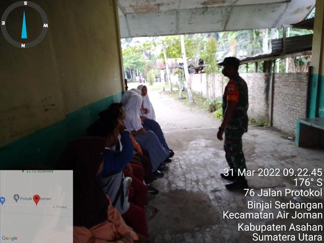 Asahan | Hal ini dilakukan Babinsa, guna memberikan wawasan , pengetahuan dan pemahaman tentang arti pancasila supaya suatu saat anak anak ini jadi generasi yg cinta kepada negaranya dan bisa menciptakan rasa toleransi dan kebersamaan dalam membangun kehidupan di tengah tengah masyarakat sekelilingnya, seperti halnya yang dilakukan oleh Personel Bintara Pembina Desa (Babinsa) Koramil 07/Air Joman jajaran Kodim 0208/Asahan Koptu Rudi turun kewilayah binaan untuk melaksanakan kegiatan Sosialisasi Salam Pancasila kepada anak sekolah yang ada diwilayah binaan, kegiatan tersebut yang dilaksanakan bertempat di Sekolah MPI Kelurahan Binjai Serbangan Kecamatan Air Joman Kabupaten Asahan, Kamis (31/03/2022).