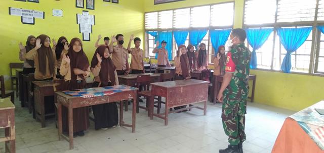 Asahan | Dalam rangka guna meningkatkan rasa jiwa nasionalisme anak sekolah dan masyarakat umum, dalam hal ini seperti yang dilakukan oleh Personel Bintara Pembina Desa (Babinsa) Koramil 11/Simpang Empat jajaran Kodim 0208/Asahan Serka Sutarno turun kewilayah binaan untuk memberikan wawasan kebangsaan dan Sosialisasi tentang pengucapan Salam Pancasila kepada para siswa-siswi yang ada diwilayah binaan, kegiatan tersebut yang dilaksanakan bertempat di SMP Negeri 1 Simpang Empat Desa Simpang Empat Kecamatan Simpang Empat Kabupaten Asahan, Selasa (10/05/2022).