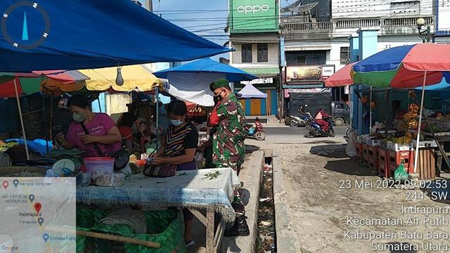 Batu Bara | Para pedagang dan pembeli merasa senang dengan adanya himbauan dari Babinsa, agar masyarakat selalu mengikuti Protokoler Kesehatan yg telah ditetapkan oleh Pemerintah guna mencegah penyebaran Virus Covid-19, menyikapi hal tersebut Personel Bintara Pembina Desa (Babinsa) Koramil 02/Air Putih jajaran Kodim 0208/Asahan Sertu David Purba dan Serda Supriadi turun kewilayah binaan ditempat keramaian dengan melaksanakan Pengamanan Disiplin Mandiri Covid-19 di Pasar Delima Indrapura dengan menghimbau para pengunjung dan pedagang selalu mengunakan masker dan mencuci tangan serta jaga jarak antar pengunjung,agar terhindar dari penyebaran penularan Covid-19, kegiatan yang dilaksanakan tersebut bertempat di Pasar Delima Indrapura Kelurahan Indrapura Kecamatan Air Putih Kabupaten Batu Bara, Senin (23/05/2022).
