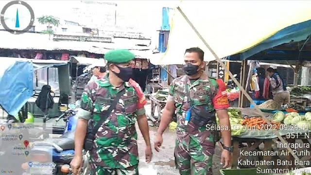 Batu Bara | Para pedagang dan pembeli merasa senang dengan adanya himbauan dari Babinsa, agar masyarakat selalu mengikuti Protokoler Kesehatan yg telah ditetapkan oleh Pemerintah guna mencegah penyebaran Virus Covid-19, menyikapi hal tersebut Personel Bintara Pembina Desa (Babinsa) Koramil 02/Air Putih jajaran Kodim 0208/Asahan Serma L. Marpaung dan Kopda SG. Tampubolon turun kewilayah binaan ditempat keramaian dengan melaksanakan Pengamanan Disiplin Mandiri Covid-19 di Pasar Delima Indrapura dengan menghimbau para pengunjung dan pedagang selalu mengunakan masker dan mencuci tangan serta jaga jarak antar pengunjung,agar terhindar dari penyebaran penularan Covid-19, kegiatan yang dilaksanakan tersebut bertempat di Pasar Delima Indrapura Kelurahan Indrapura Kecamatan Air Putih Kabupaten Batu Bara, Selasa (07/06/2022).