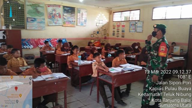 Tanjung Balai | Dalam menerapkan nilai-nilai Pancasila kepada para anak sekolah diwilayah binaan, dalam hal ini seperti yang dilakukan oleh Personel Bintara Pembina Desa (Babinsa) Koramil 08/Pulau Buaya jajaran Kodim 0208/Asahan Sertu HM Pasaribu turun kewilayah binaan untuk melaskanakan kegiatan Komunikasi Sosial (Komsos) bersama dengan Guru dan Murid SD Negeri 136573 tentang Vaksin ke anak-anak agar tetap terhindar dari Covid-19 bagi usia 6-11 Tahun dan tetap sehat melaksanakan proses belajar mengajar serta mensosialisasikan dan menanmkan Nilai-nilai Pancasila kepada anak siswa-siswi tersebut bersama dengan Ibu Khairina, kegiatan tersebut yang dilaksanakan bertempat di SD Negeri 136573 Kelurahan Kapias Pulau Buaya Kecamatan Teluk Nibung Kota Tanjung Balai, Sabtu (12/03/2022).