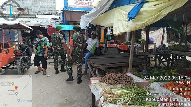 Batu Bara | Untuk mendukung program pemerintah guna mendisiplinkan masyarakat agar menerapkan protocol kesehatan, dalam hal ini seprti yang dilakukan oleh Personel Bintara Pembina Desa (Babinsa) Koramil 02/Air Putih jajaran Kodim 0208/Asahan Peltu Budi. S dan Sertu David turut melaksanakan pengamanan Disiplin Mandiri Covid 19 di Pajak Delima Indrapura dengan menghimbau para pengunjung dan pedagang agar sll menggunakan masker dan pencuci tangan serta jaga jarak antar pengunjung agar terhindar dari penyebaran penularan covid 19. Giat tersebut bertempat di Pajak Delima Indrapura, Kelurahan Indrapura, Kecamatan Air Putih, Kabupaten Batu Bara, Kamis (24/03/2022).