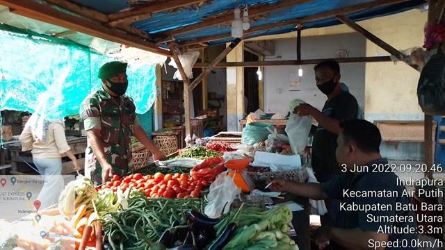 Batu Bara | Pusat keramaian ini menjadi salahsatu titik yang menjadi perhatian TNI sebagai langkah untuk memutuskan matarantai penyebaran virus corona Covid-19, patroli penegakan disiplin protokol kesehatan ini selain Babinsa juga tampak Bhabinkamtibmas juga dan tampak tenaga kesehatan yang bertugas melaksanakan kegiatan ini, seperti yang dilakukan oleh Personel Bintara Pembina Desa (Babinsa) Koramil 02/Air Putih jajaran Kodim 0208/Asahan Sertu Risman dan Serda supardi turun kewilayah binaan untuk melaksanakan Pam Disiplin Mandiri Covid-19 di Pasar Delima Indrapura dengan menghimbau kepada para pedagang dan pembeli agar selalu mencuci tangan dengan sabun, menggunakan masker dan menjaga jarak serta menghindari kerumunan guna mencegah penularan Covid-19, kegiatan tersebut yang dilaksanakan bertempat di Pasar Delima Kelurahan Indrapura Kecamatan Air Putih Kabupaten Batu Bara, Jumat (03/06/2022).