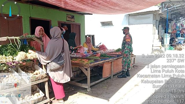 Batu Bara  |  Dalam kesempatan itu, Babinsa Serda Sapion memberikan himbauan kepada warga untuk tetap menerapkan protokol kesehatan saat melaksanakan aktivitas jual beli, yakni selalu gunakan masker, seperti halnya yang dilakukan oleh Personel Bintara Pembina Desa (Babinsa) Koramil 03/Lima Puluh jajaran Kodim 0208/Asahan Serda Sutikno turut serta melaksanakan kegiatan Komsos kepada para pedagang dan Pengunjung serta bersilaturahmi kepada para Pedagang serta sekaligus mengecek harga harga bahan pangan dan juga menghimbau kepada para pedagang maupun pengunjung agar selalu menjaga kebersihan lingkungan Pasar dengan tidak membuang sampah sembarangan dan membuang sampah pada tempat yang sudah di siapkan agar tetap terjaga kebersihan Pasar bersama dengan Kepling IV Bapak Misdi dan Masyarakat/Pedagang Lingkungan IV Lima Puluh Kota, kegiatan tersebut yang dilaksanakan bertempat di Lingkungan IV Kelurahan Lima Puluh Kota Kecamatan Lima Puluh Kabupaten Batu Bara, Jumat (03/06/2022).