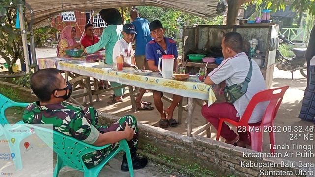 Batu Bara | Agar terjalinya hubungan baik antara Babinsa dan Masyarakat Desa untuk menunjang Tupoksi Apter, seperti yang dilakukan oleh Personel Bintara Pembina Desa (Babinsa) Koramil 02/Air Putih jajaran Kodim 0208/Asahan Pelda Sunardy turun kewilayah binaan untuk melaksanakan kegiatan Komunikasi Sosial (Komsos) bersama dengan warga binaan dalam rangka untuk menghimbau warga untuk selalu menjaga kebersihan dan kesehatan serta Penegakan Disiplin Protokol Kesehatan serta menghimbau kepada warga terkait tentang Protokol Kesehatan, menghimbau kepada warga agar selalu mematuhi anjuran pemerintah, Memakai masker, Menjaga jarak, Menghindari kerumunan dan Mengurangi mobilitas dalam rangka guna mencegah penyebaran virus Covid-19 bersama dengan Tomas Bapak Parlin Sitorus, Polmas Bapak Napitupulu dan Warga Bapak Taufik, kegiatan tersebut yang dilaksanakan bertempat di Warung Ibu Sipar Dusun 8 Desa Tanah Tinggi Kecamatan Air Putih Kabupaten Batu Bara, Sabtu (28/05/2022).
