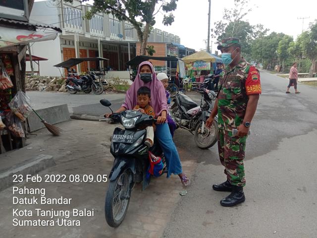 Tanjung Balai | Guna untuk memutus mata rantai penyebaran Virus Covid 19 di wilayah Binaan, supaya setiap beraktifitas diluar rumah agar senantiasa memakai masker, menjaga jarak dan sesering mencuci tangan sesuai dengan anjuran Pemerintah tentang Protokol Kesehatan, dalam hal ini seperti yang dilakukan oleh Personil BIntara Pembina Desa (Babinsa) Koramil 17/Datuk Bandar jajaran Kodim 0208/Asahan Koptu Ruswandy turun kewilayah binaan untuk melaksanakan Penegakan Disiplin Protokol Kesehatan untuk melaksanakan pengawasan protokol Covid-19 kepada masyarakat dengan memberikan Masker kepada masyarakat serta memberikan pemahaman New Normal yaitu menggunakan masker setiap keluar rumah,cuci tangan pakai sabun, menjaga jarak dan dengan menghimbau warga dalam rangka mencegah penyebaran Virus Covid-19, kegiatan tersebut yang dilaksanakan bertempat di Jalan H.M. Nur Kelurahan Pahang Kecamatan Datuk Bandar Kota Tanjung Balai, Rabu (23/02/2022).
