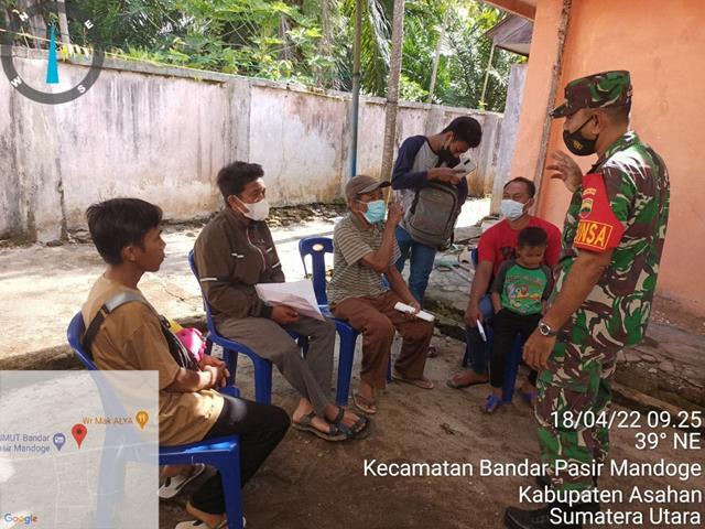 Asahan | Guna untuk memutus mata rantai penyebaran Virus Covid 19, dalam rangka mensukseskan program pemerintah guna mendisiplinkan masyarakat agar menerapkan protokol kesehatan, dalam hal ini Personil Bintara Pembina Desa (Babinsa) Koramil 14/Bandar Pasir Mandoge jajaran Kodim 0208/Asahan Serka P. Marpaung turun kewilayah binaan untuk melaksanakan kegiatan Anjangsana untuk memberikan himbauan kepada masyarakat yang belum Vaksin selalu tetap mematuhui protokol Kesehatan Covid-19 kepada masyarakat dengan memberikan pemahaman New Normal yaitu menggunakan masker setiap keluar rumah, cuci tangan pakai sabun, menjaga jarak dan membagikan masker dalam rangka agar tetap memakai masker dan mencuci tangan untuk mencegah penyebaran Virus Covid-19 bersama dengan Bapak Wandi, Bapak Hendra, Bapak Rudiman, Bapak Nirman Manurung dan Bapak Pernando Sinaga, kegiatan tersebut yang dilaksanakan bertempat di Dusun ll Desa Bandar Pasir Mandoge Kecamatan Bandar Pasir Mandoge Kabupaten Asahan, Senin (18/04/2022).