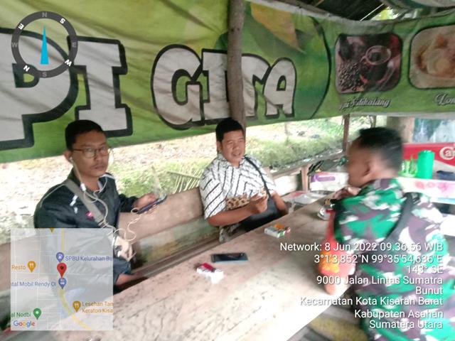 Asahan | Dalam rangka untuk mempererat silaturrahim dengan warga binaannya, dalam hal ini seperti yang dilakukan oleh Personel Bintara Pembina Desa Koramil 06/Kisaran jajaran Kodim 0208/Asahan Sertu M Fitro turun kewilayahbinaan untuk melaksanakan kegiatan Komunikasi social (Komsos) bersama dengan warga desa binaan diantaranya adalah Bapak Aden pemilik warung, Bapak Ayub dan Bapak Rudi dalam rangka membahas tentang keamanan dan ketertiban lingkungan, kegiatan tersebut yang dilaksanakan bertempat di Jalan S. Parman Lingkungan 2 Kelurahan Bunut Barat Kecamatan Kisaran Barat Kabupaten Asahan, Rabu (08/06/2022).