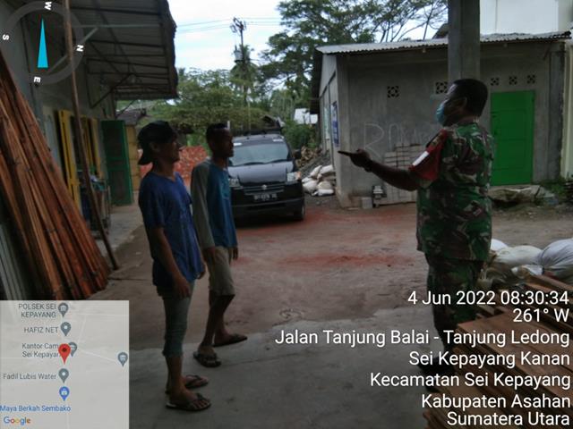 Asahan | Dalam rangka untuk menjalin silaturahmi antara masyarakat dengan Babinsa dan untuk meningkatkan hubungan yang baik untuk kelancaran tugas dan tanggung jawab Babinsa serta meningkatkan kemanunggalan TNI dengan Rakyat, supaya terjalinnya tali silaturahmi antara Babinsa dengan perangkat Desa wilayah binaan, seperti halnya yang dilakukan oleh Personel Bintara Pembina Desa (Babinsa) Koramil 10/Sei Kepayang jajaran Kodim 0208/Asahan Sertu Syahrizal turun kewilayah binaan untuk melaksanakan kegiatan Komunikasi Sosial (Komsos) bersama dengan warga Desa Sei Kepayang Kanan dalam rangka untuk menghimbau warga Desa agar melaksanakan Protokol Kesehatan dimana pun berada agar terjalinnya Komunikasi yang baik dan mempererat tali silaturrahmi antara Babinsa dengan warga Desa guna menciptakan suasana yang Harmonis, aman dan tentram, kegiatan tersebut yang dilaksanakan bertempat di Dusun 2 Desa Sei Kepayang Kanan Kecamatan Sei Kepayang Kabupaten Asahan, Sabtu (04/06/2022).