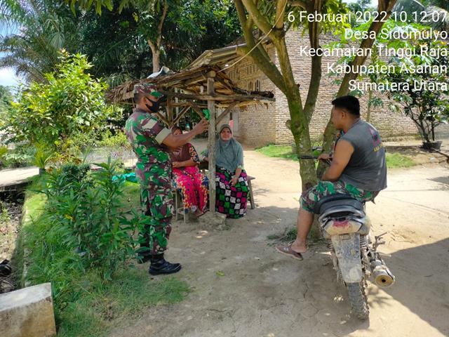 Asahan  |  Agar terjalin silaturahmi antara Babinsa dengan warga Agar selalu menjaga Kesehatan di dalam melaksanakan aktivitas sehari-hari semasa Pandemi Virus Covid-19 ini serta agar tercipta kerjasama dan hubungan yang baik antara Babinsa dengan  perangkat desa binaan, seperti halnya yang dilakukan oleh Personel Bintara Pembina Desa Koramil 13/Buntu Pane jajaran Kodim 0208/Asahan Serda Andarin turun langsung kewilayah desa binaan untuk melaksanakan Komunikasi Sosial (Komsos) bersama dengan warga masyarakat binaan dalam rangka untuk membina silaturahmi dengan warga desa serta mengajak warga untuk menjaga kebersihan lingkungan terutama membuang air limbah kamar mandi dan tempat pembuangan air besar di jamban, agar tidak menimbulkan penyakit diare dan penyakit ke lainnya, kegiatan tersebut yang dilaksanakan bertempat di Desa Sidomulyo Kecamatan Tinggi Raja Kabupaten Asahan, Minggu (06/02/2022).