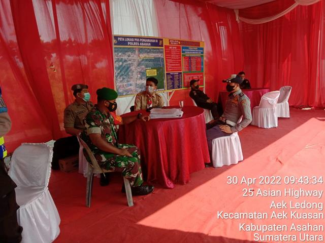 Pada pelaksanan kegiatan Pos PAM menyambut Idul Fitri 1 Syawal 1444 H diadakan penyekatan bagi warga masyarakat yang melintas masuk dan keluar dari Jalinsum Medan-Rantau Perapat memeriksa Kendaraan dan warga masyarakat agar tetap melaksanakan Prokes yang ditetapkan oleh Pemerintah Kabupaten Asahan tersebut turut serta dihadiri oleh, Kapos PAM lll/ Wakapos PAM lll Lebaran, Personel TNI- AD : 1 Org, Personel TNI – AL : 0 Org, Polsek Pulau Raja : 4 Org, BNN : 0 Org, Satpol PP : 2 Org, Dishub : 2 Org, Nakes : 2 Org dan Pramuka : 2 Org.