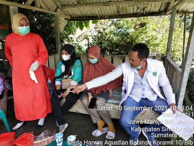 Simalungun | Dalam rangka untuk mencegah penyebaran COvid-19 diwilayah binaa, Personel Bintara Pembina Desa (Babisna) Koramil 10/Balimbingan jajaran Kodim 0207/Simalungun Serda Harwin Agustian turun kewilayah binaan untuk melaksanakan kegiatan pendampingan pihak Medis Puskesmas Jawa Maraja Bah Jambi dan Puskesbun Bah Jambi untuk melaksanakan pemeriksaan Tracing Kontak erat terhadap 5 warga setempat berhubung adanya warga setempat yang terkonfirmasi Covid 19 an. MHD Asril Nasution untuk mencegah penyebaran Virus Covid 19, kegiatan tersebut yang dilaksanakan bertempat di Daerah Pondok Blendet Nagori Bah Jambi Kecamatan Jawa Maraja Bah Jambi Kabupaten SImalungun, Jumat (10/09/2021).