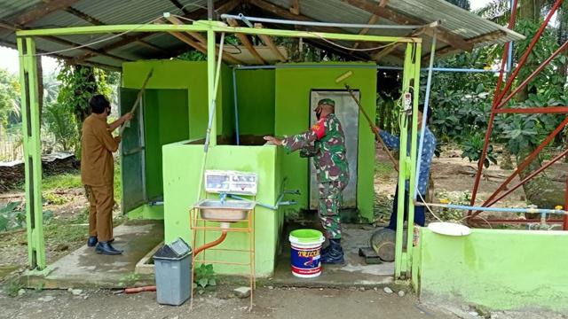 Selesai – Babinsa Koramil 02/Selesai kodim 0203/Langkat Serda Purwanto bersama Apartat Desa dan warga melaksanakan kegiatan Gotong Royong membersihkan dan pengecetan WC Musholla merupakan bentuk kepedulian Babinsa di Dusun Payaluas Desa Selayang Kec Selesai Kabupaten Langkat, Senin ( 6/09/2021).