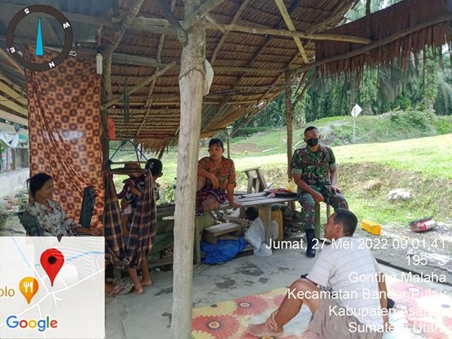 Asahan  |  Dalam rangka agar terjalinnya tali silaturahmi dan hubungan yang harmonis antara Babinsa dengan masyarakat Desa binaan. Seperti yang dilakukan oleh Personel Bintara Pembina Desa (Babinsa) Koramil 15/Bandar Pulau jajaran Kodim 0208/Asahan Serka Dody Setiawan turun kewilayah desa binaan untuk melaksanakan kegiatan Komunikasi Sosial (Komsos) bersama dengan masyarakat selaku wilayah desa binaannya serta giat Komsos dengan warga binaan tentang Penerapan Prokes dan Mengajak Masyarakat Supaya vaksin serta guna menjalin hubungan yang baik antara Babinsa dengan warga binaan bersama dengan Bapak Sumarianto (Petani), Ibu Sumartik (Ibu rumah tangga) dan Ibu Sri wiyani (Ibu rumah tangga), kegiatan tersebut yang dilaksanakan bertempat di Dusun 2 Desa Gonting Malaha Kecamatan Bandar Pulau Kabupaten Asahan, Jumat (27/05/2022).